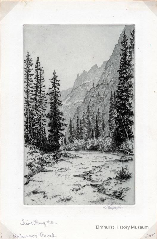 Etching: A tree-lined creek below mountains in the background. Mounted on a 2-page mat. Signed and dated. Trial proof #3.