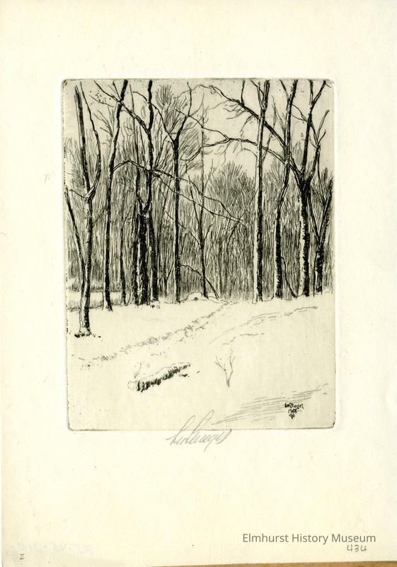 Etching of a snow-covered path leading into a snowy woods. Signed and dated.