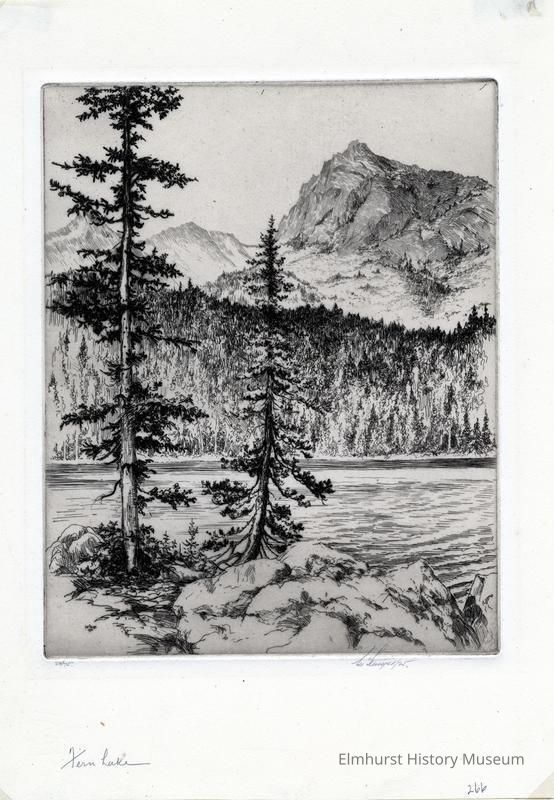 Etching of a lake with mountains in the background. Mounted on a 2-page mat. Signed and dated. #20/75.