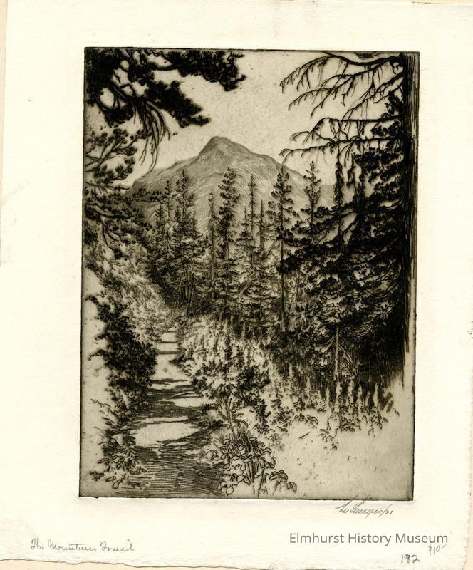 Etching of a path in a mountainous forest. Mounted in a two-page mat. Signed and dated.