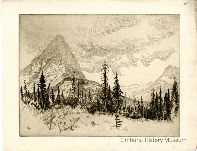 Etching of a forest in the foreground, a mountain top in the background. Signed and dated.