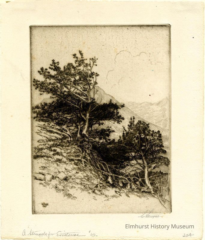 Etching of trees on a mountain side. Signed and dated. Mounted in a 2-page mat.