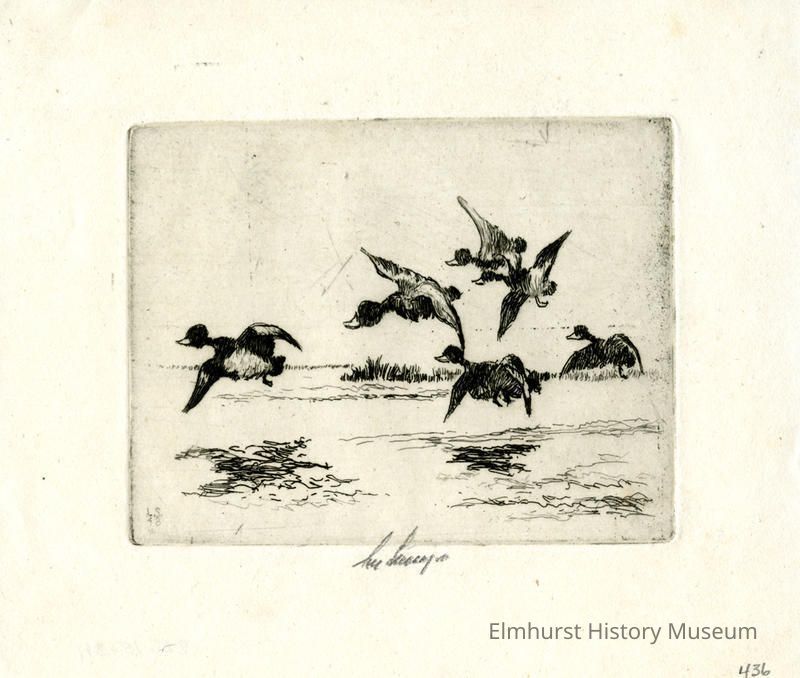 Etching of six flying geese over water. Initialled by author.