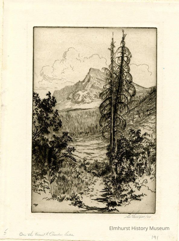 Etching of a mountain. Mounted in a 2-page mat. Signed and dated.