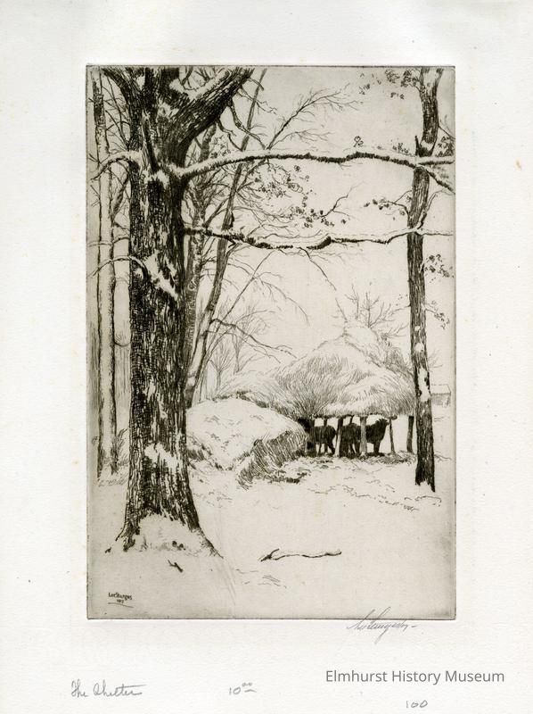 Etching: a snow scene featuring cattle standing under a thatched shelter. Signed and dated. Etching is mounted in a two-page mat. Label on back of large mat.