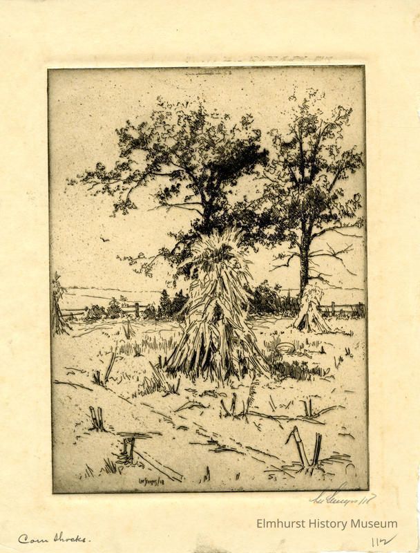 Etching mounted on a 2-page mat: etching features a large shock of cornstocks in the center and trees, more cornshocks and a fenceline in the background. Signed and dated.