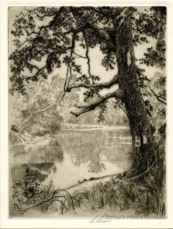 Etching of a tree-lined river. The etching is mounted on a 2-page mat. Signed and dated.