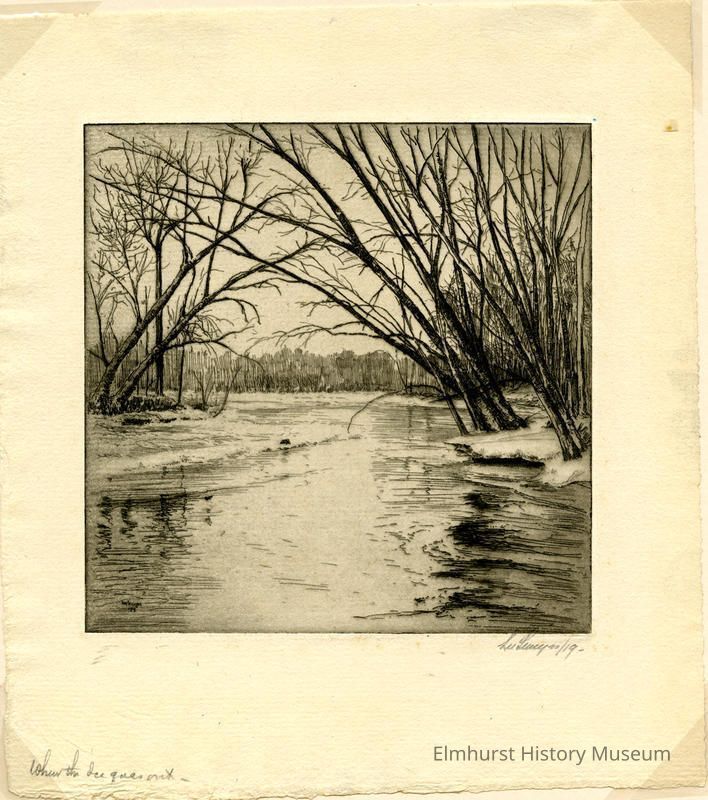 Etching of a river in winter. The etching is mounted on a 2-page mat. Signed and dated.