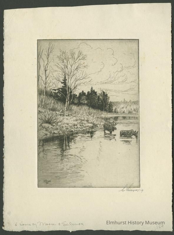 Etching of two moose in a river. Signed and dated. Mounted in a two-page mat.