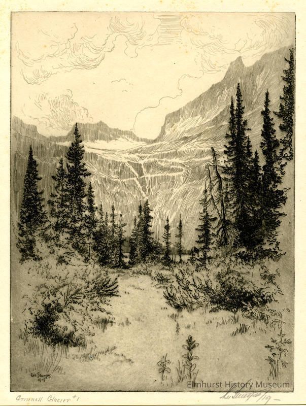 Etching of a mountain scene with trees in the midground and mountains with a glacier in the background. Signed and dated.