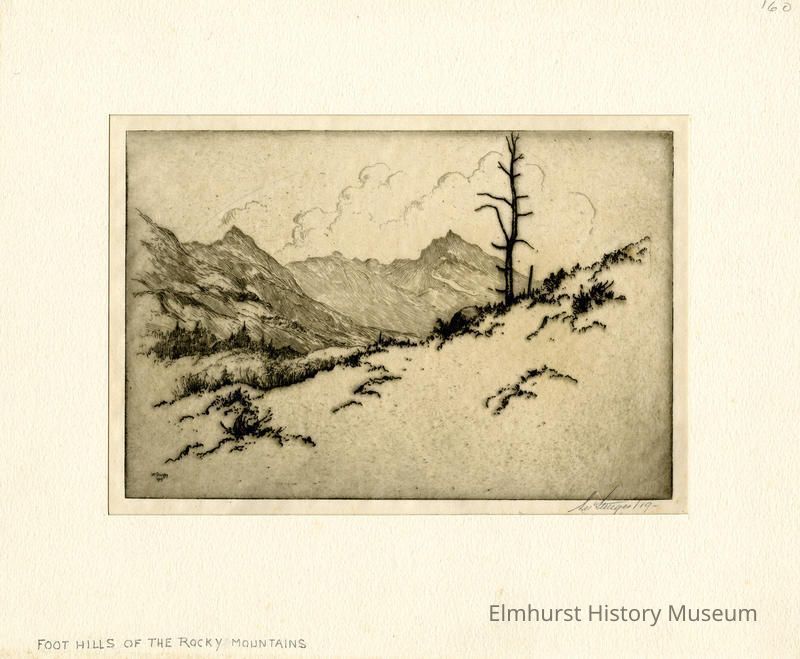 Etching: mountains in the background. A lone, bare tree appears in the right midground. Signed and dated. Mounted in a 2-page mat.