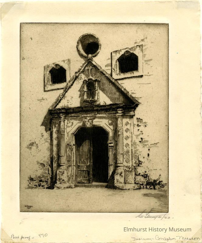Etching of the entrance of a mission. Mounted in a 2-page mat. Signed and dated. (Note: Plate for this etching is part of 88.24 accession.)
