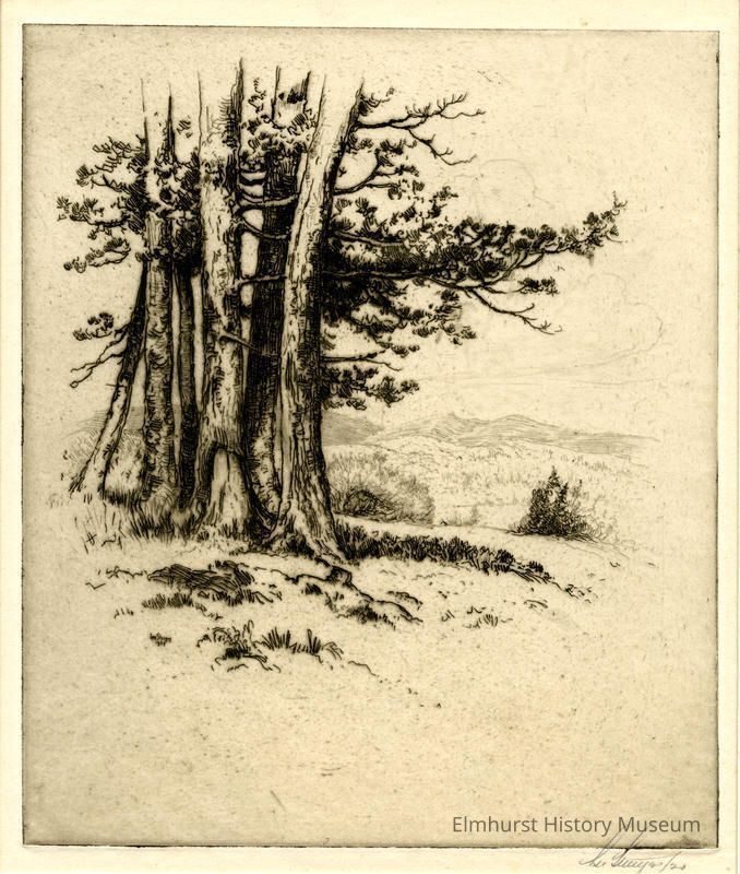 Etching of a clump of trees; mountains in the background. Mounted in a 2-page mat. Signed and dated.