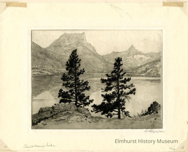 Etching of a lake surrounded by mountains. Mounted in a 2-page mat. Signed and dated. Titled St. Mary's Lake.