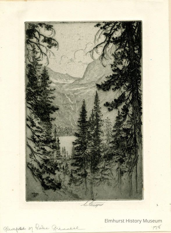 Etching of a lake seen through a forest clearing. Mounted in a 2-page mat. Signed and dated.