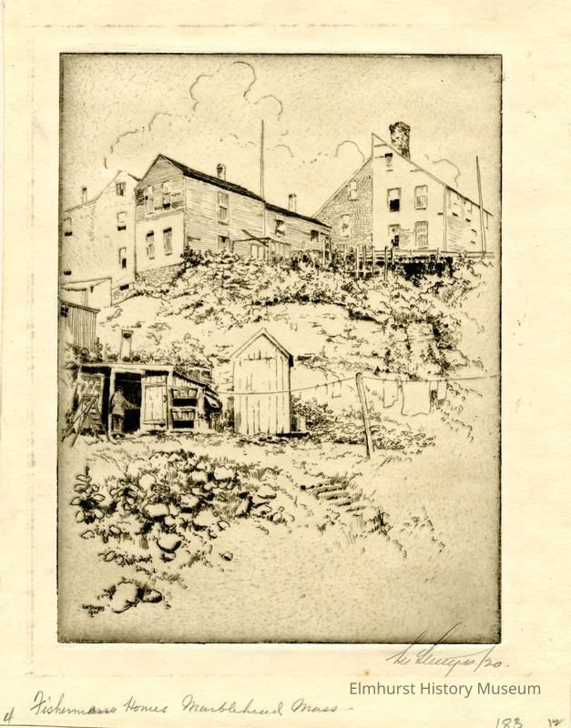 Etching of several buildings on a hill. Mounted in a 2-page mat. Signed and dated.
