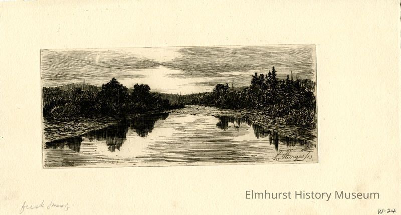 Etching of a wide river with trees on both shores. First proof. Signed and dated.