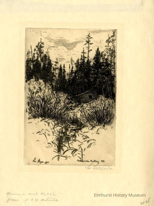 Etching of a log cabin surrounded by woods and brush. Signed and dated.