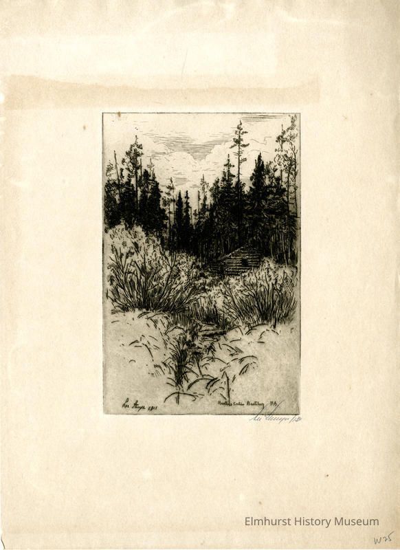 Etching of a log cabin surrounded by woods and brush. Signed and dated.