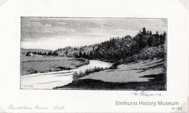 Etching of a curving river with a forest on the right shore and a meadow on the left shore. Signed and dated.