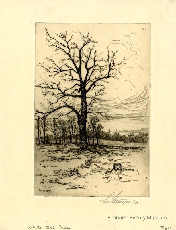 Etching of a large, bare oak tree. Signed and dated.