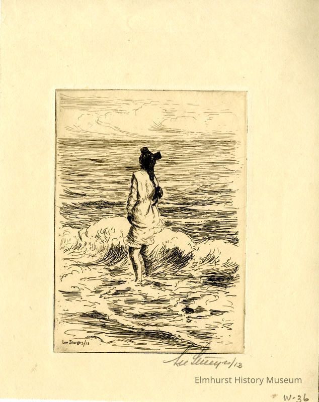 Etching of a young woman wading in the ocean (or other large body of water). Signed and dated.