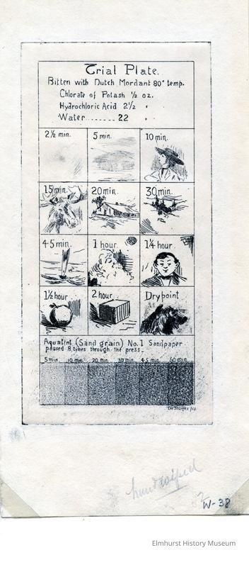 The top of the etching says, "Trial Plate./ Bitten with Dutch Mordent 80 temp/ Chlorate of Potash 1/2 oz./ Hydrochloric Acid 2 1/2 "/ Water...... 22 "." There are twelve squares with a different image in each one ( i.e. girl, apple, dog, etc.) with various amounts of time above each of the twelve boxes. Signed and dated.