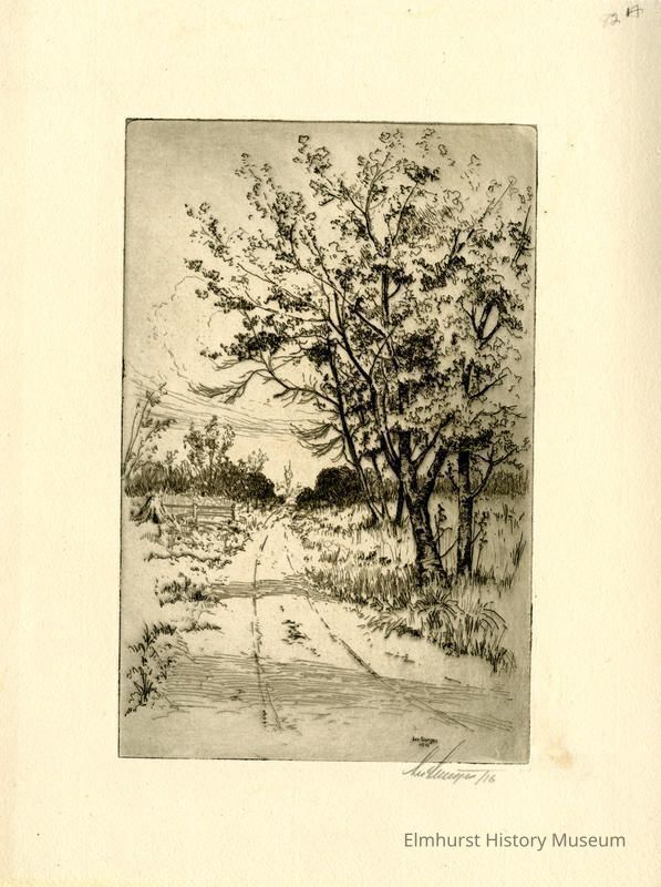 Etching of a country road with trees in foreground. Signed and dated.