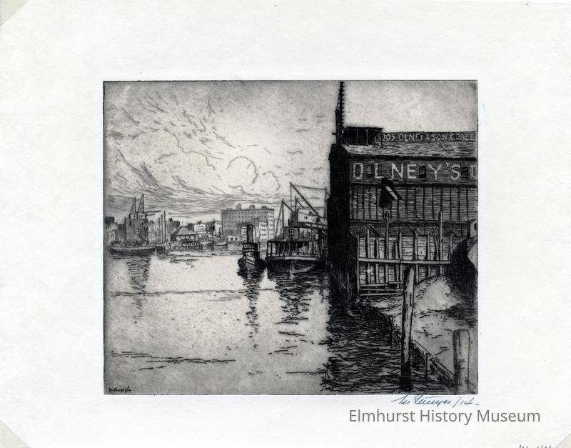 Etching of a city waterfront scene with ships. Signed and dated.