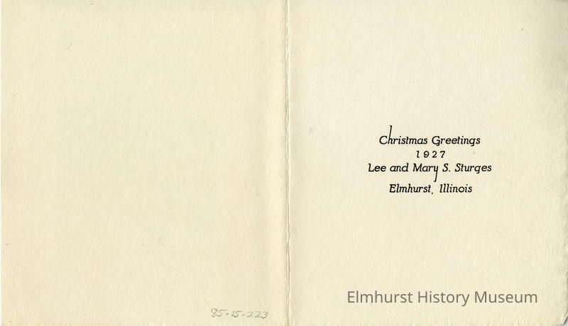 Etching of a mountain scene mounted on a card measuring 10" x 5.5". Signed and dated. The front of the card has the following printed: "Christmas Greetings 1927 Lee and Mary S. Sturges Elmurst, Illinois."