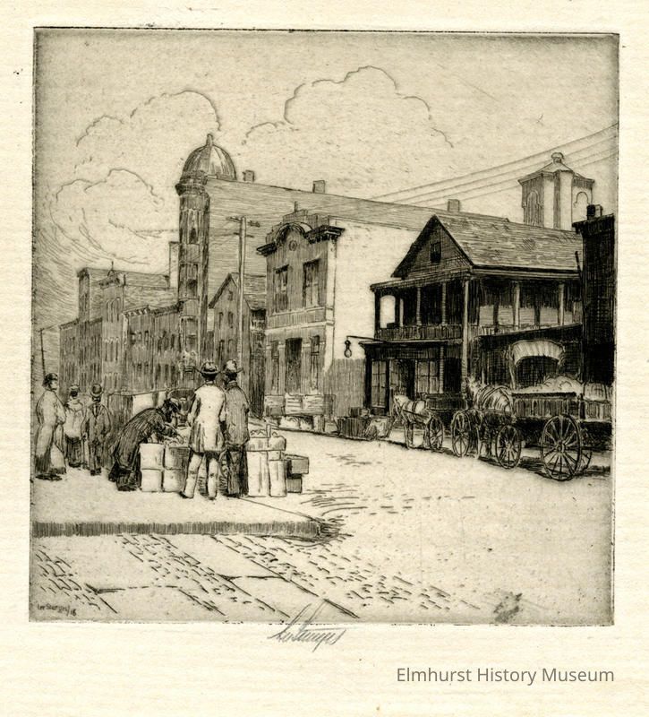 Etching: a street corner with buildings on one side of street. Two horse and wagon rigs. Six people on corner in foreground. Signed and dated.