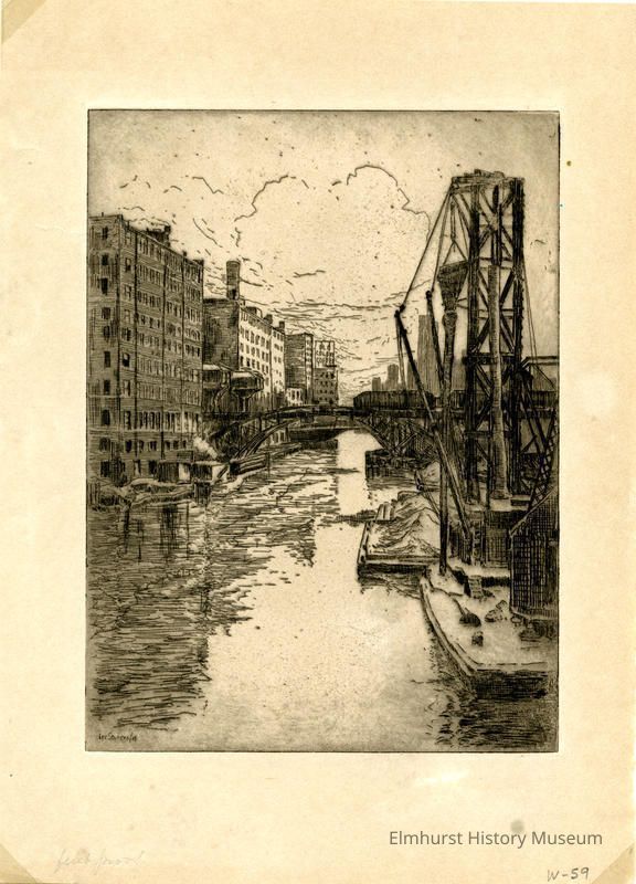 Etching of buildings along river and bridge in center. Signed and dated. First proof.