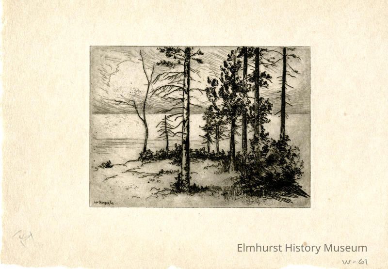 Etching: nine trees of various sizes in foreground. Water in background. Signed and dated. First proof.