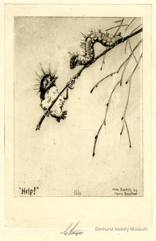 Etching of a branch with a caterpillar approaching a bird. Lower left corner of etching says, "Help!" From a sketch by Harry Roundtree. Signed and dated. First proof.