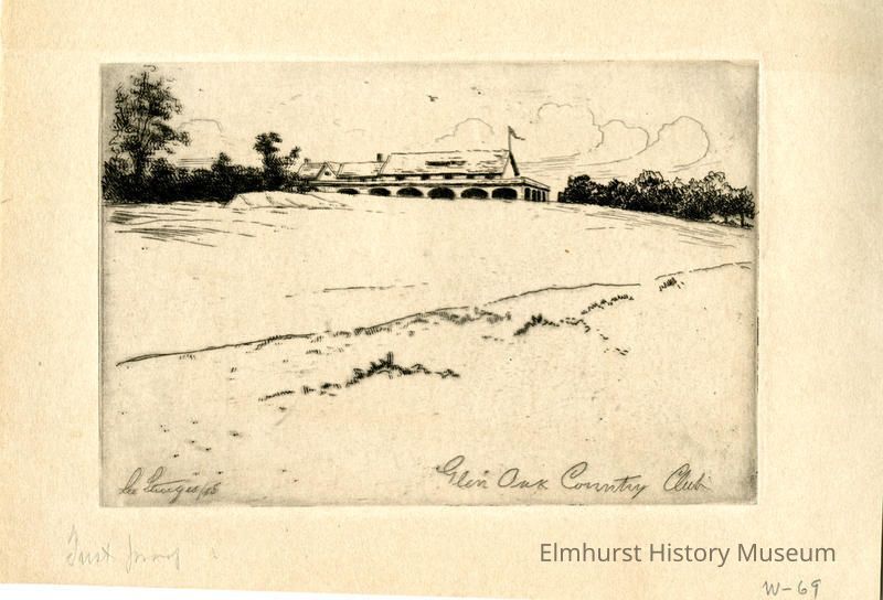 Etching of a Club house on a hill. Signed and dated. First proof.