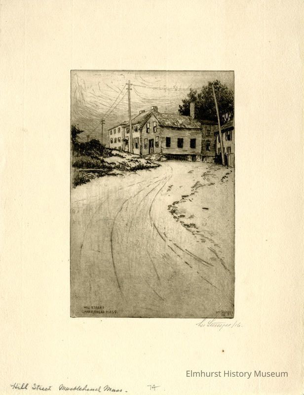 Etching of a road scene with buildings, trees and fences on either side. Signed and dated.