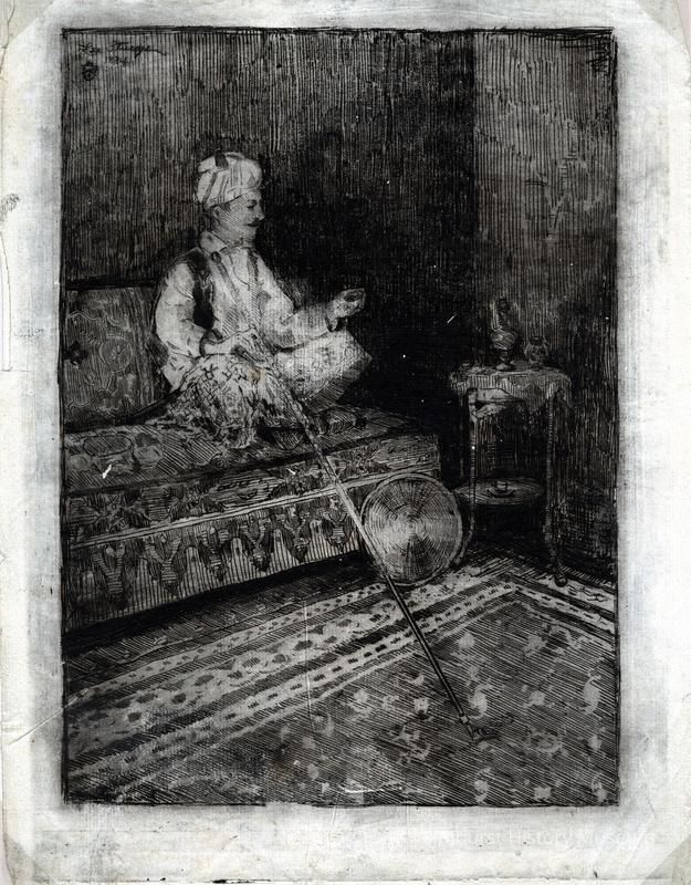Etching of an Arab Sultan, seated, holding a long pipe. Not dated.