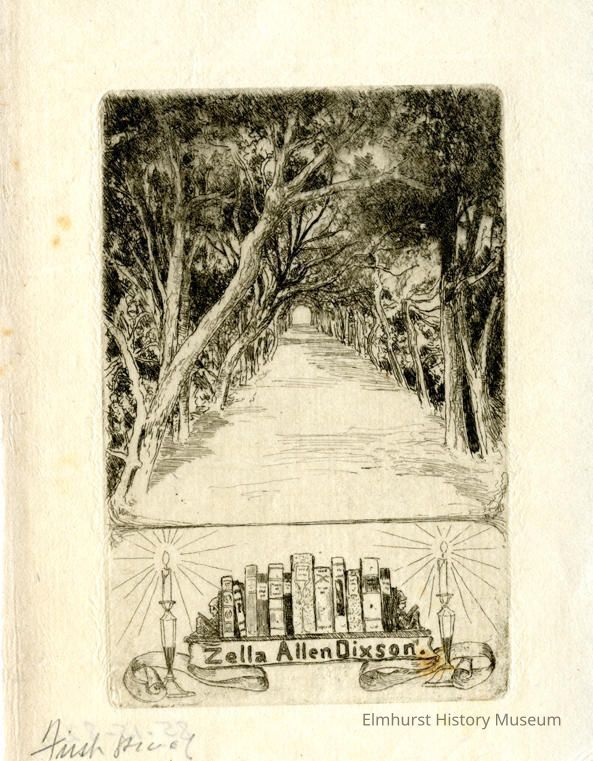 Book plate etching of a street with arched trees. Below that is a shelf of books. The shelf has the name Zellal Allen Dixson. First proof.