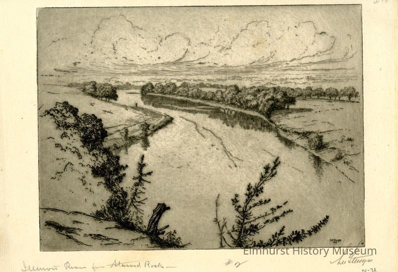 Etching of a river (the Illinois River) with trees growing in places on the banks. Stump and branches in foreground. Signed and dated.