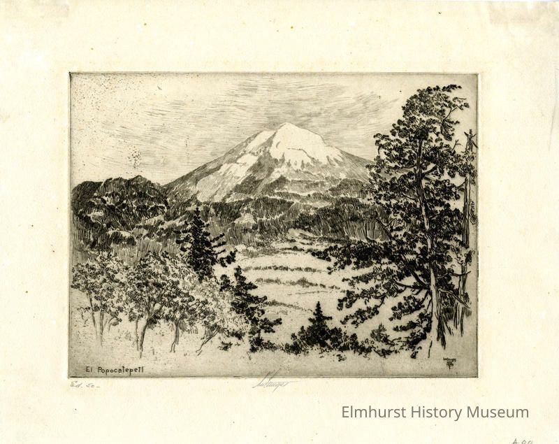 Etching of a mountain (El Popocatepetl volcano, Mexico) the background. Signed and dated.