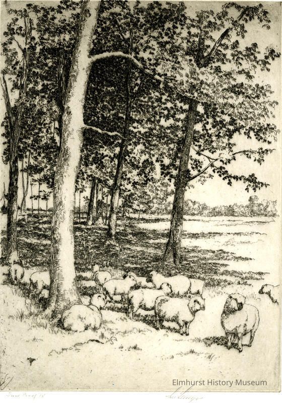 Etching of several sheep in a grove of trees. Trial Proof IV. Signed and dated.
