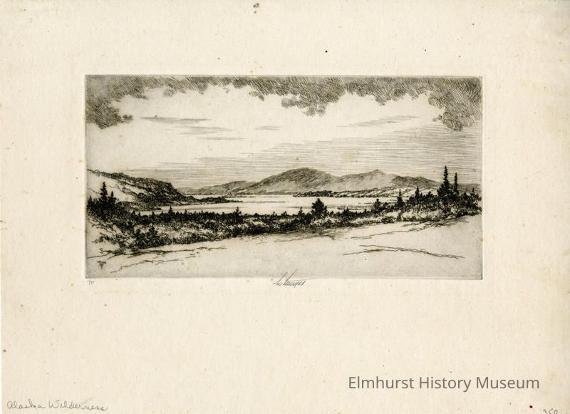Etching: tree and body of water in midground, mountains in the background. Signed and dated.