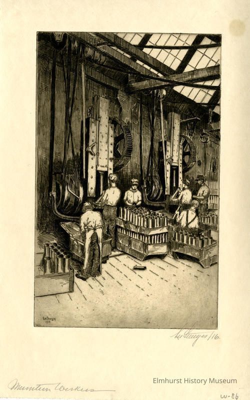 Etching of factory interior with line shaft and belts running punch presses making shell casings. Signed and dated.