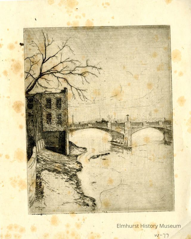 Etching of a bridge over a river, wall and building on left. Signed and dated.