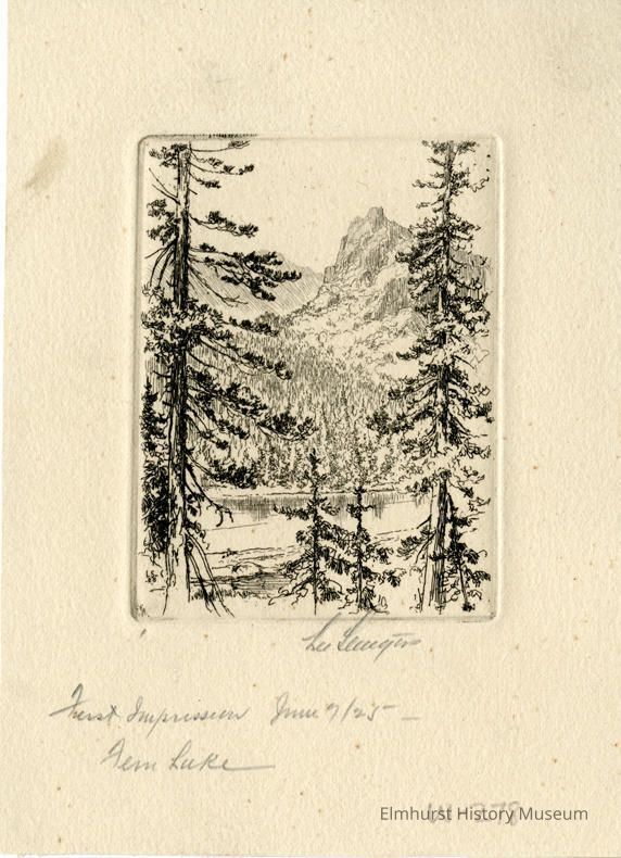 Etching: trees in foreground, then a lake, with mountains in the background. Signed and dated. First impression.