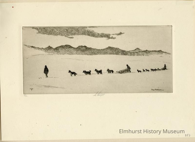 Etching of two dog sleds. Mounted in a 2-page frame. Signed and dated.