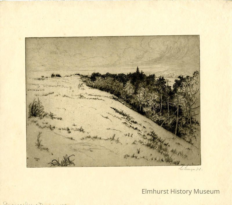 Etching of sand dunes on the left and trees on the right. Signed and dated.
