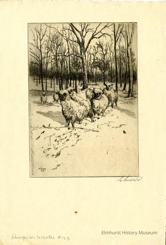 Etching of a group of sheep in a snowy field. Signed and dated.