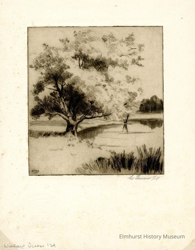 Etching of a large willow tree on the bank of a lake. Signed and dated.