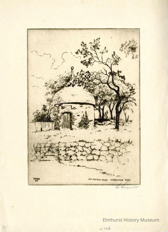 Etching of a small circular building with a tower-like roof. Signed and dated.